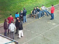 Int kortrijks stationetje, 's middags reedlijk late, stonden zeven kakkertjes mensen om te rijde. |