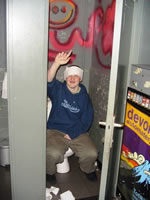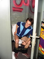 Hij doet het in zijn broek. (vant lachen?) |